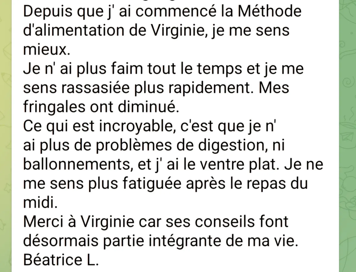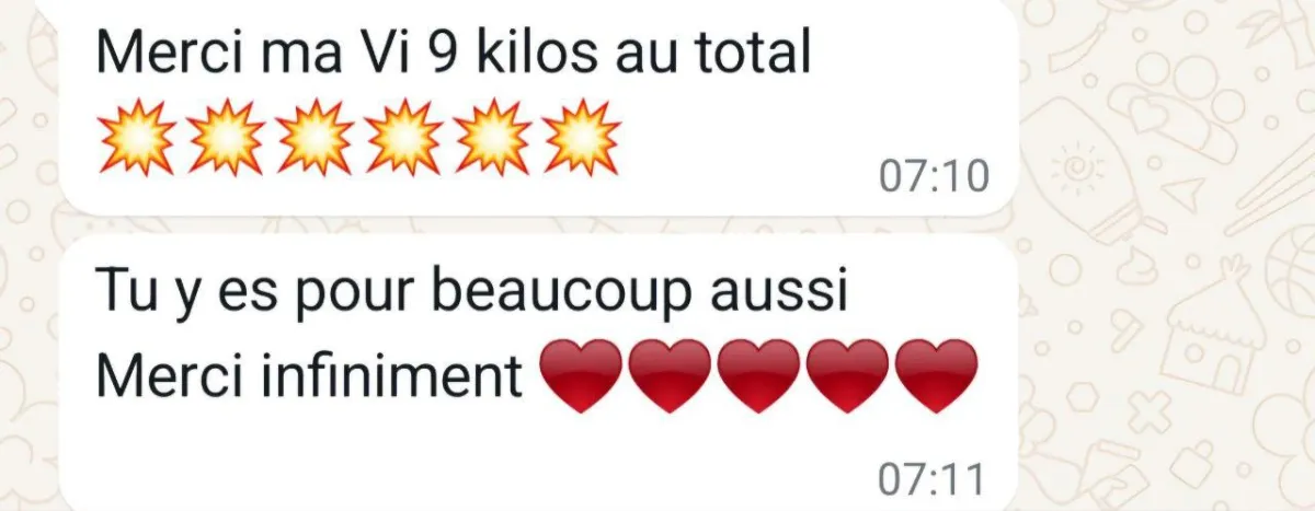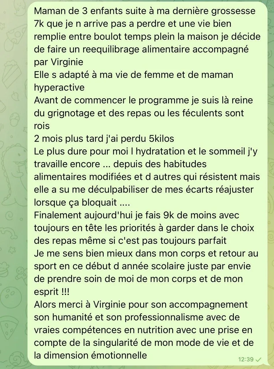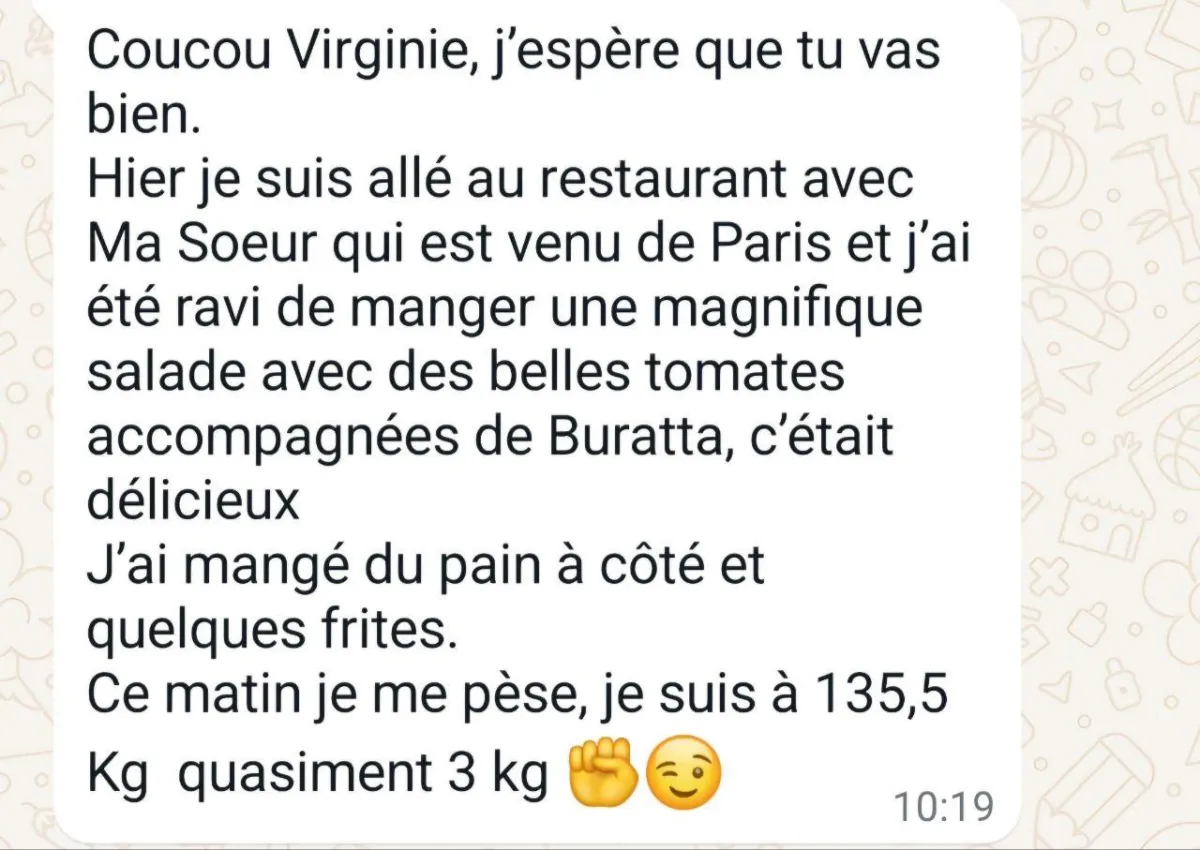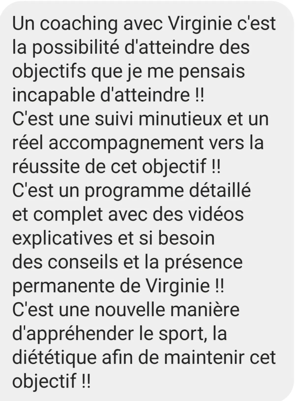 Très content de l'accompagnement de Virginie, une présence au quotidien pour des résultats que je n'aurai jamais pensé atteindre après des années dans les salles de sports, les cours collectifs plus tous les régimes sans résultats. Avec Virginie, une méthode simple, des exercices basés sur ma morphologie, un accompagnement journalier au travers de son application pour 24 kgs de moins en 24 mois et un physique que je ne pensais plus possible à obtenir a 48 ans !!!!